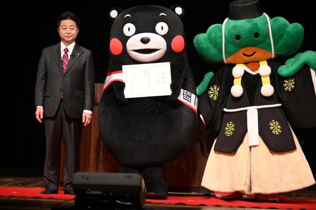 山鹿特産の和栗と鹿北茶をイメージした色のくまモンフラッグ