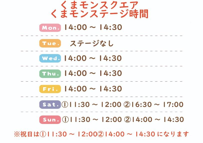 くまモンスクエアでのくまモンの在室スケジュール(ステージ時間)関してご案内をいたします。